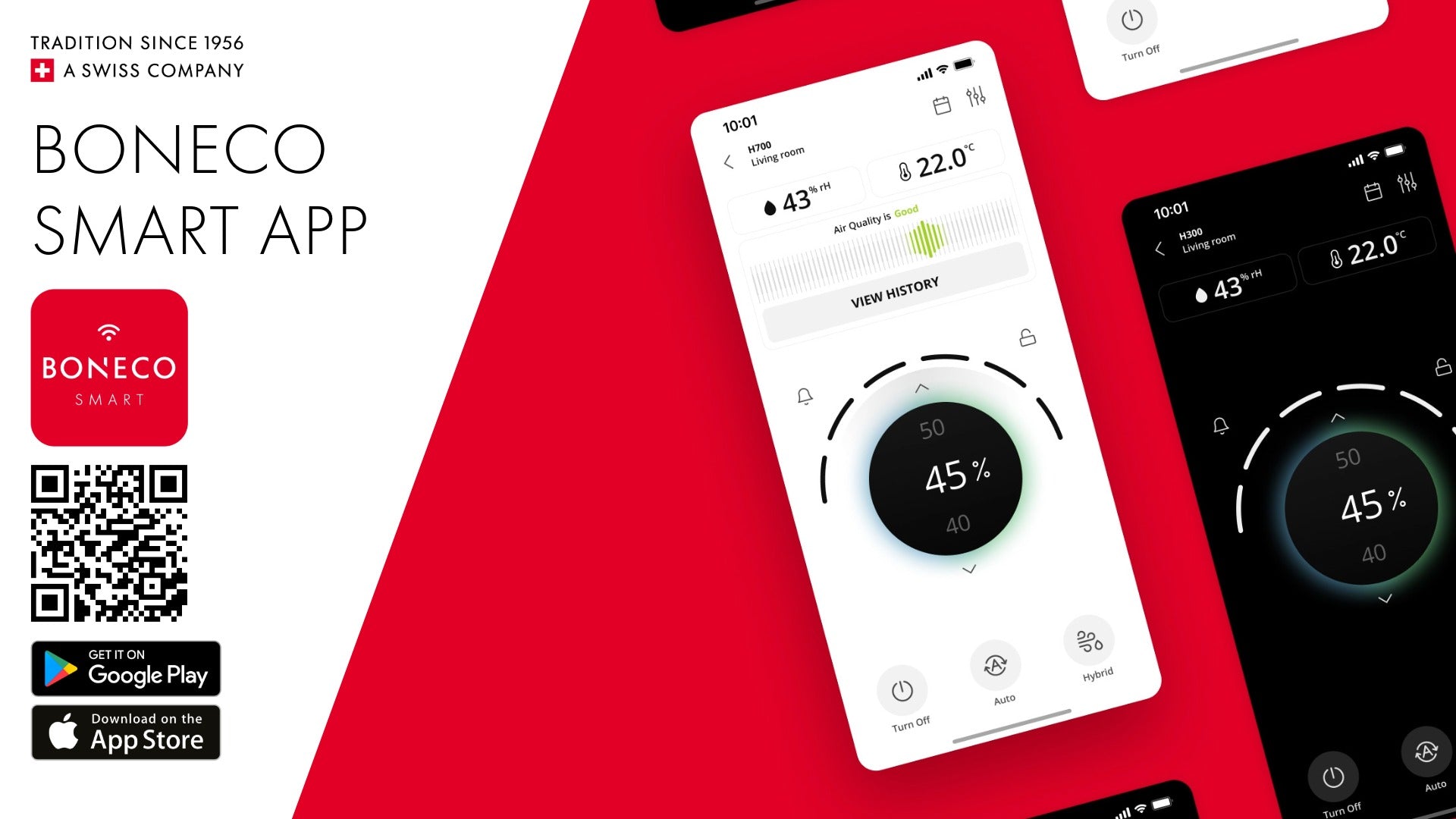 The app also integrates seamlessly with smart home systems and supports voice control. With the BONECO SMART App, you enjoy comfort, control, and perfect indoor air at the touch of a button β the ultimate upgrade for every BONECO device.
